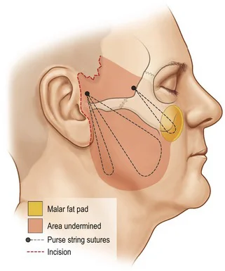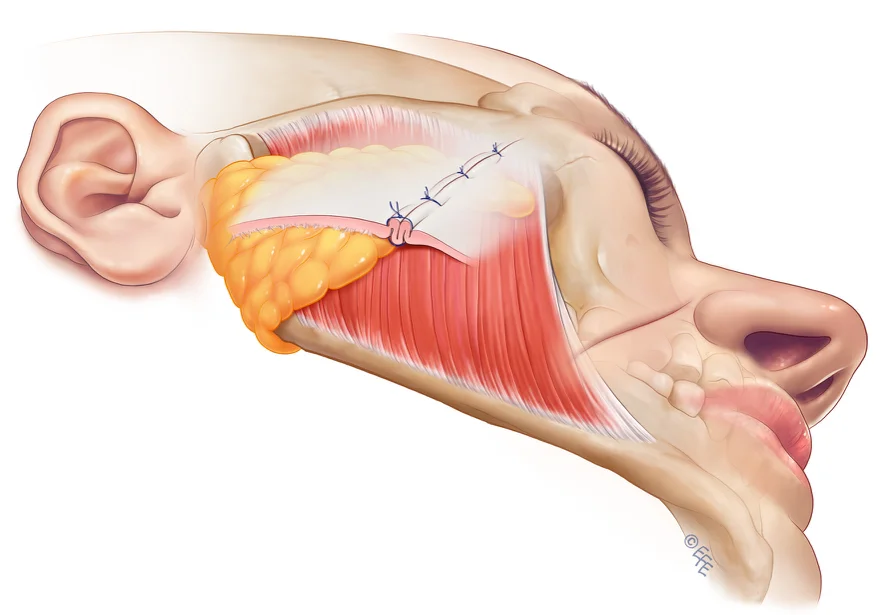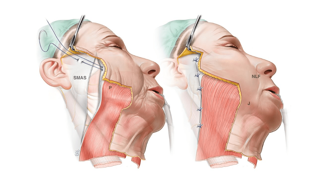 Výkon prováděn v analgosedaci nebo celkové anestezii. Cílem je svalově-vazivová struktura (tzv. SMAS – superficial musculo aponeurotic systém), která se nachází pod kůží. Během operace je SMAS vypnutý a následně plikován nebo zredukován, to má za následek menší tah na kůži. Sutura je pak jemná a minimálně roztažená