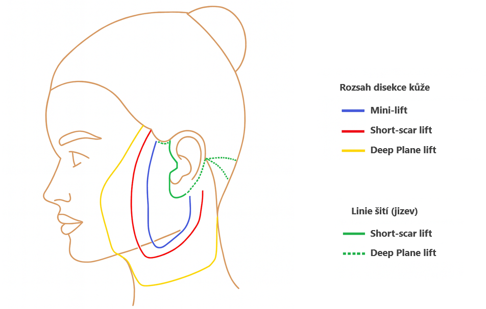 Jednotlivé facelifty se liší rozsahem operace, hloubkou preparace, různým vedením řezů a výsledným efektem. Rozlišujeme: