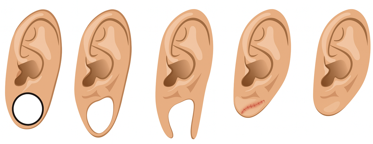 Opětovné roztržení/roztažení ušní dírky (nenosit po operaci náušnice minimálně 3 měsíce)