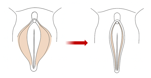 Během operace se upraví tvar a velikost malých stydkých pysků na úroveň velkých. Množství tkáně, které se odstraní, by mělo být předem vyměřeno, aby nedošlo k nechtěné nadměrné resekci a následným komplikacím (diskomfort, bolesti, záněty, jizvení...). Je více operačních postupů (central/inferior wedge resekce, running W-plasty, central w/z plasty…). Já osobně preferuji podélní direktní odstranění převisu s pečlivou hemostázou a následnou intradermální suturou. Výhodou této operace je, že má velice dobrou rekonvalescenci, málo komplikací a pacientka nemusí opětovně trpět při vytahování stehů